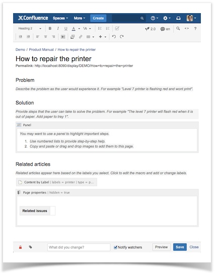 Space administrators can easily create custom page templates in each Confluence space, or modify existing ones.