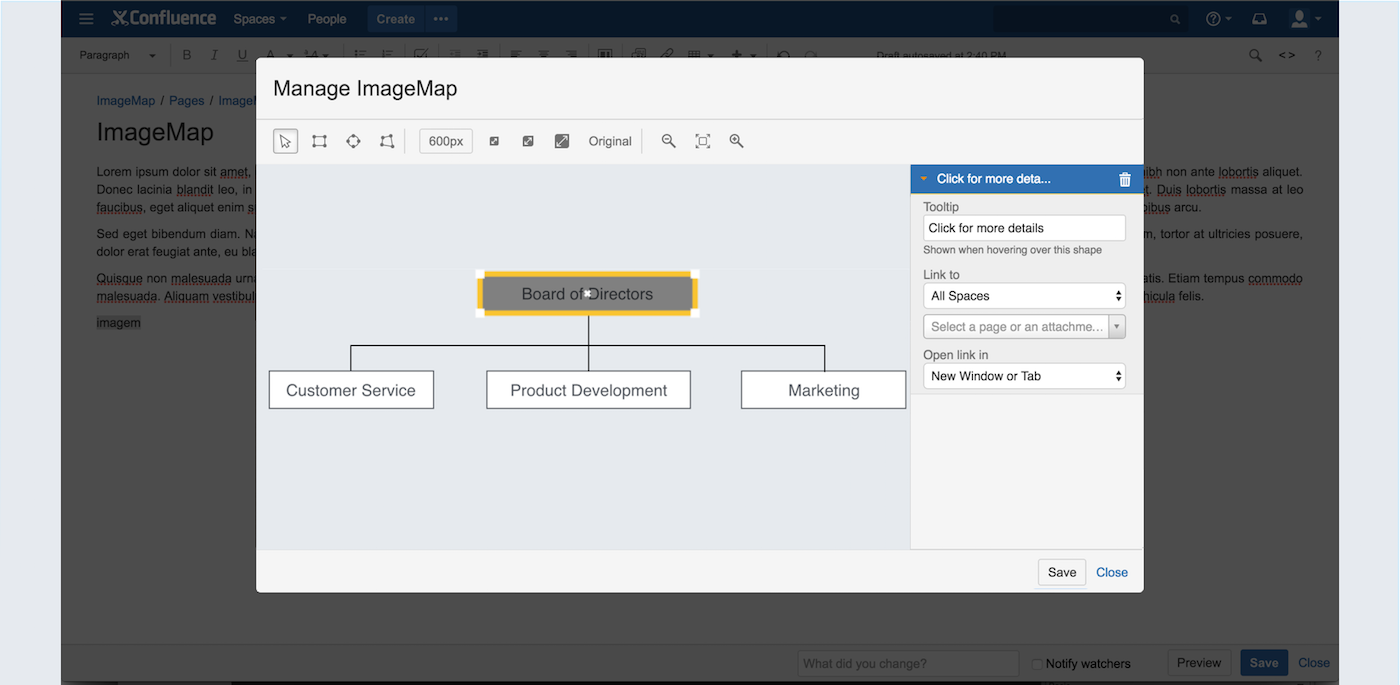 It's simple to draw any shape you need – from squares and circles to complex polygons – directly onto your image. Control not only your image map regions, but also your image's display size and zoom level. The built-in editor is simple and intuitive to use, making it easy for team members of all experience levels to add interactivity and messages to Confluence images.