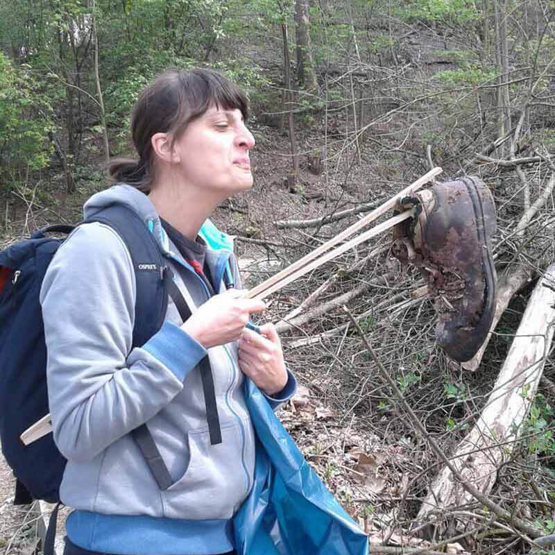 Shortly after our K15t forest clean-up crew gathered at the trail head in Stuttgart South, it became obvious that finding garbage wouldn't be a problem. As soon as we started paying attention and looking for trash it seemed as if we were surrounded by it – everything from small, transparent plastic bags to larger, more curious litter items. Anja was the first to discover one of these more unexpected pieces – a abandoned shoe.