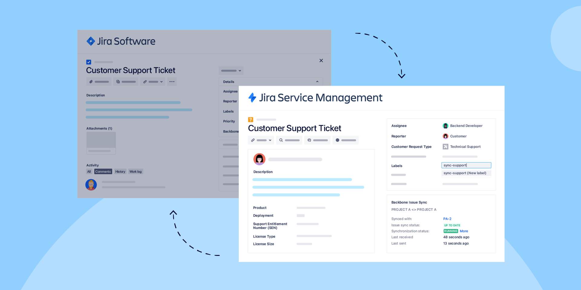 Similarly, referring to the earlier example of collaborating in JSM with software development teams, you can use the Atlassian Marketplace app Backbone Work Sync for Jira to copy and assign tickets from a JSM project to other JSM or Jira projects without even adding other teammates to the particular project. All tickets, along with comments and attachments, can be automatically copied and synced across Jira and JSM projects while every team continues to work within their own Jira projects.